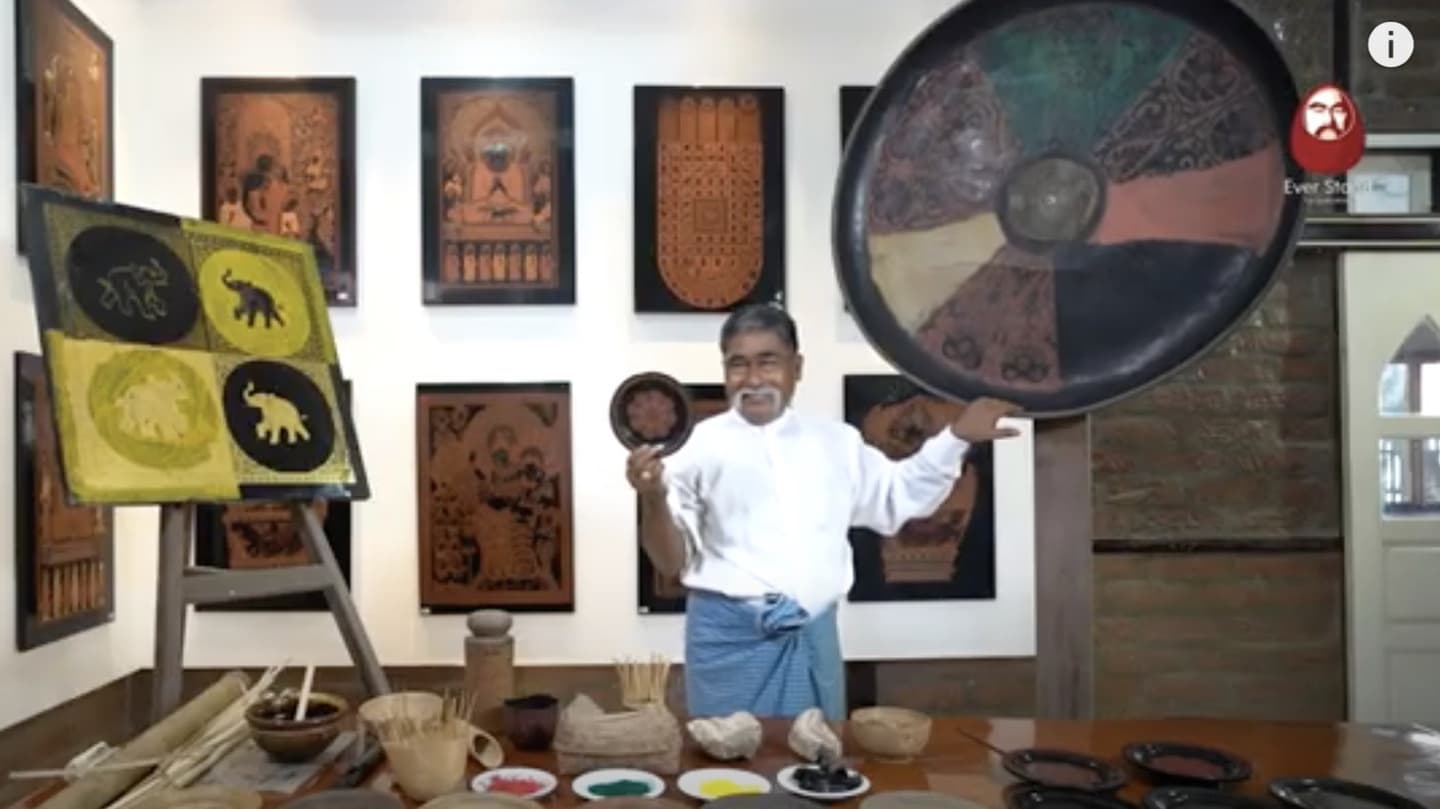 U Maung Maung demonstrates and explains the steps in the Bagan. lacquerware process, including substrate preparation, coating and etching, pigments, polishing, and gilding.  U Maung Maung, is Chairman of the Myanmar Lacquerware Association, and owner of Everstand Lacquerware Workshop.