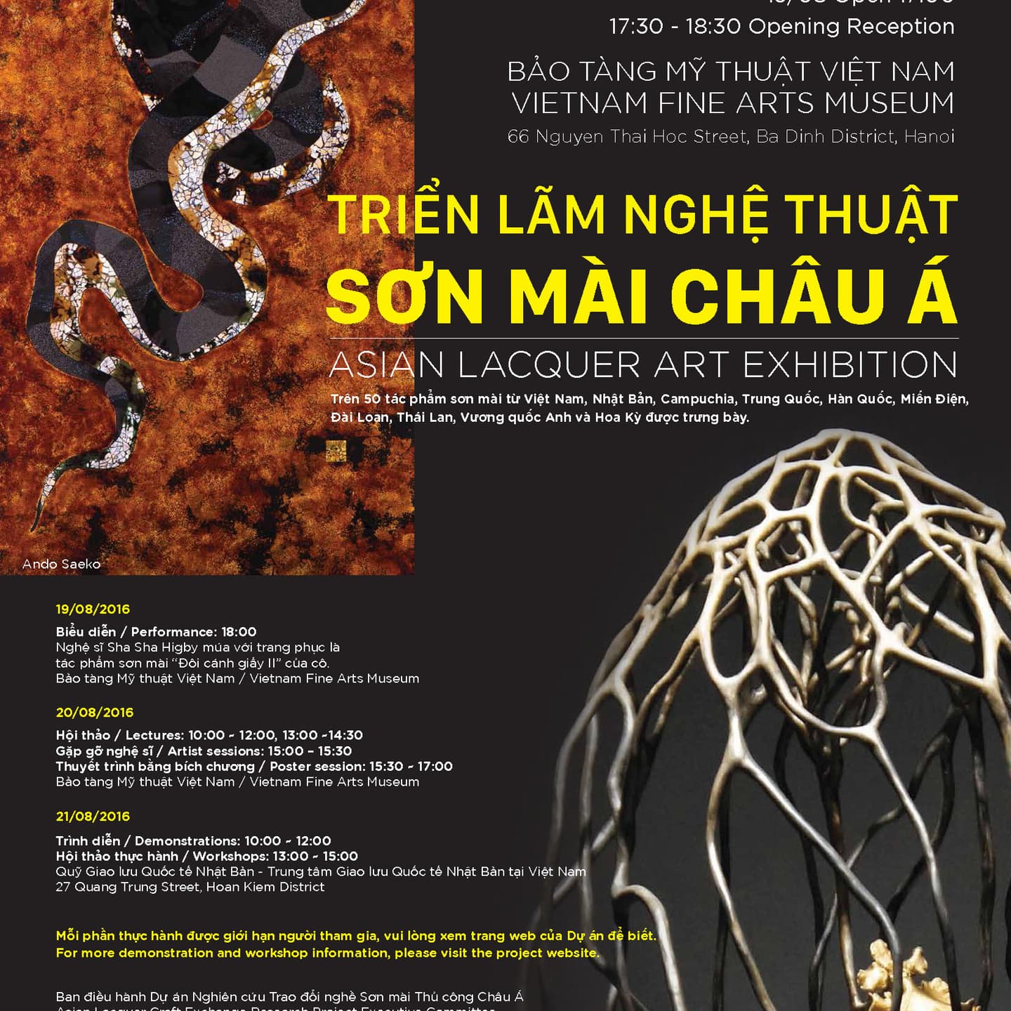 Lacquer artworks from Vietnam and other East and Southeast Asian nations as well as from the UK, and USA were displayed. The exhibition and symposium included a poster session on aspects of lacquer arts, history and culture. Fifty artists exhibited, showcasing a wide variety of contemporary lacquer art using diverse designs and techniques. Text panels explained the current state of lacquer arts and crafts in each country. The lectures at the museum were on lacquer technique, science, and culture. The Japan Foundation Center for Cultural Exchange was the venue for demonstrations and workshops by artists and artisans from Vietnam, Japan, and Myanmar.