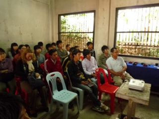 ・漆とは何かースライドレクチャー・日本や諸外国の漆素材と歴史・漆による表現の展開について、北川美穂氏によりスライドレクチャーを行なった。過去数度にわたる調査においても、ラオスで漆器作りを行なっているという情報はほとんど得られなかった。一部復興させようという動きもあるが、産業としてはまだ成り立っているとはいえない。漆もラオス国内では産出されず、タイやミャンマーからの輸入に頼っている。美術学校でも漆に関する授業は開講されておらず、学生も教員も漆に関する知識のほとんどない。Ounheuane先生は、以前ミャンマーのバガンで漆の技術を学んだ経験があり漆器制作に意欲的である。ワークショプ・レクチャーには塗物の制作を行なっている工房の技術者も参加した。