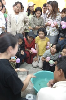 風船に水に溶かした紙をのせて成形してゆく