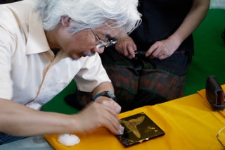 ・前日行った、ミャンマーキンマ刀と日本の沈金刀による、2羽のカワセミに金箔を入れる予定であったが、準備した金箔に限りがあったため、持参した金粉(消粉)を入れることにした。各自、摺漆を行い拭き取り、金消粉を真綿にて蒔いていった。ミャンマーキンマ刀は先が尖っており、均一でシャープな線が彫れるのに対し、日本の沈金刀の形状は先端が丸くなっており、彫り跡はなだらかで金を入れると光を反射し、より金の輝きがよいことなど比較した。前日までの話を聞き、早速彫った図案に金箔を入れたものを持参してきた参加者(ニューバガンの漆器店の職人)がいたのには驚いた。