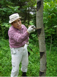 日本では、ウルシノキは岩手、茨城、新潟、福島、栃木、京都、岡山、広島などで採取されています。ほとんどが植林で、十数年で採取されますが、採取する年には、だいたい5月から10月くらいまでの間、十数回にわたって、幹に傷をつけ滲み出てくる樹液を採取します。