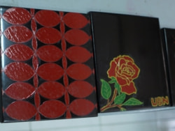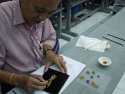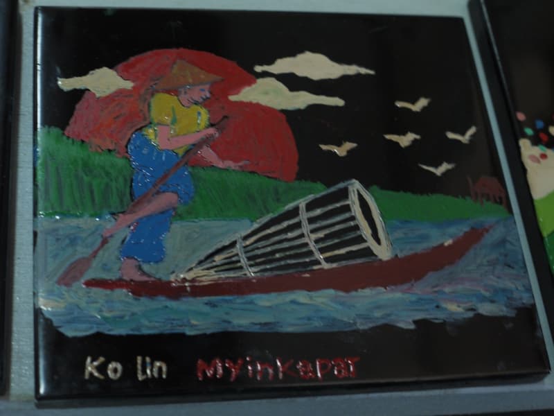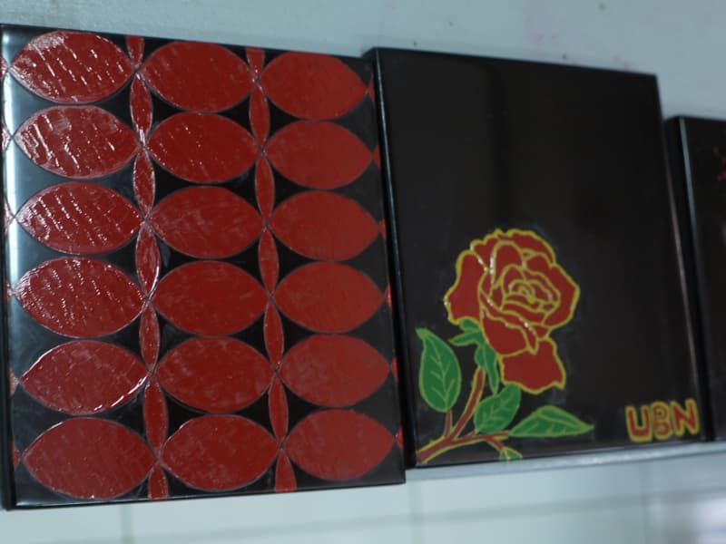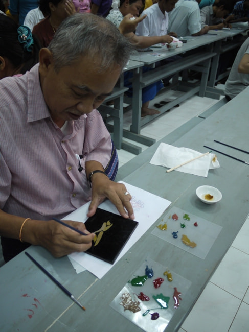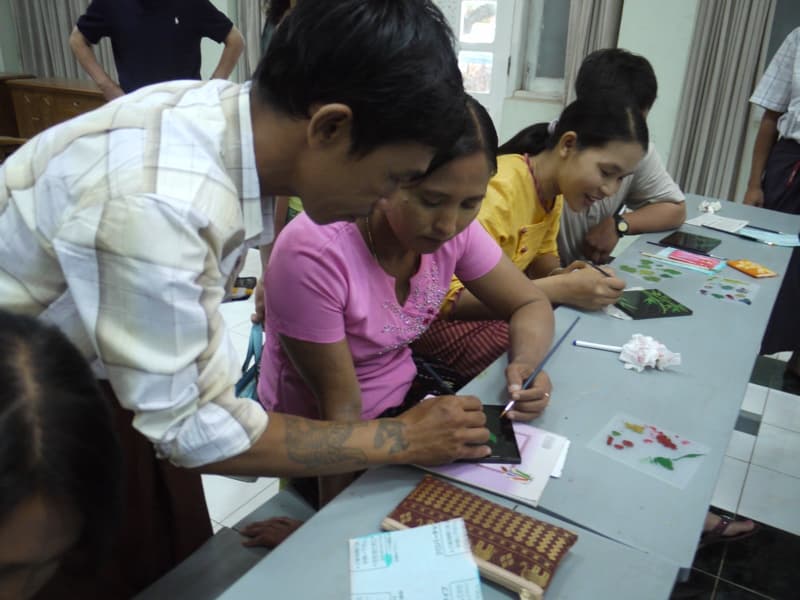 日華化成有限会社 山本修氏からの顔料のご提供により、日本で開発された人体に害のない顔料とミャンマーの漆を使用した色漆表現に取組んだ。パーマネントカラー黒箱の赤口・黄口・レモン・新橋・青竹・草・空・もも・紫・白の10色漆を20gづつ調合していく。アルコールで顔料を湿らせてから乳鉢でミャンマー漆を混合する。ミャンマー人技術者の指導を受け、ミャンマーで朱漆などに入れるピーナッツオイルを少量混ぜて艶と粘度を調整した。参加者はあらかじめ考えてきた図案を黒漆板転写し、各自色漆をパレットにとり、筆を使用し自由な表現に挑戦していった。ミャンマーで使用されている色漆は朱(赤口)・朱(黄口)・黄・緑(黄に藍で着色)・オレンジ(朱と黄を混合)のみであるので、日本の多数の色を使用し絵画的な表現に挑戦している人が多くみられた。ただ、粘りのある色漆を筆で描くことに慣れないようで、道具の扱いに戸惑う人もいた。この試みから作る人にも使う人にも安全安心な漆器の制作、色漆を使用した新たな漆表現や漆器開発が期待されよう。