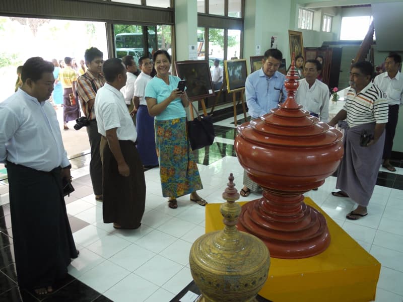 日本24名、タイ・カンボジア・ベトナム・台湾在住の作家4名、ミャンマー30名の作品を一堂に約70点の展示を行った。日本と外国の作家は、この十年間の活動に参加いただいた方々で、伝統工芸、器、オブジェ、立体造形、ジュエリー、漆画など幅広い作品が展示された。また、乾漆・螺鈿・蒔絵・変塗り・蒟醤など加飾技法も幅広い作品が並んだ。ミャンマーの作品は、ミャンマーの伝統的な蒟醤・箔絵に加え、変塗りや乾漆等の日本の影響を受けた作品もあった。また供物器や仏像などの伝統的な形式の作品が多いが、漆画やお面、柱を囲む丸机、飾棚、ジュエリースタンドなど新たなデザインに挑戦した作品もあった。
