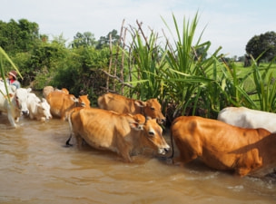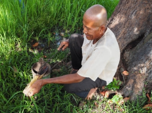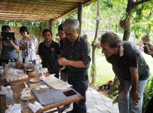 At 06:00, participants boarded a bus for a 90-minute drive to a village near Stoung in Kampong Thom Province to visit Mr. Ta Ly, the lacquer sap collector who supplies Angkor Artwork. The group waded through inundated paddies to reach the trees. This was unusual for many participants who were accustomed to seeing lacquer trees in mountain forests. Ta Ly demonstrated how he tapped the trees. His tools to cut away the bark and method of attaching the bamboo cups were quite different than those used in Myanmar and Thailand. The bamboo cup itself is longer and attached below the cut a more vertically than by collectors in the other two nations. Ta Ly said that it was just beginning of the collection season. He answered questions about the amount his was able to collect. Some questions asked were how fast the cups filled with sap, and how much each tree produced, and how many months per year he collected. The field seminar gave participants to talk more informally. The trek through the knee-deep water of the rice paddies was fun and a good chance to bond.