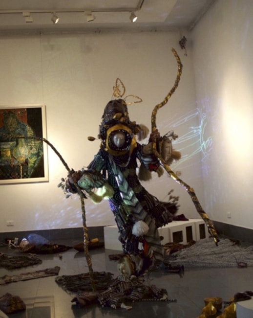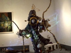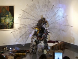 Sculptured-costume performance artist Sha Sha Higby used her own uniquely designed lacquered body sculptures to create a poetic solo performance that was very well received.